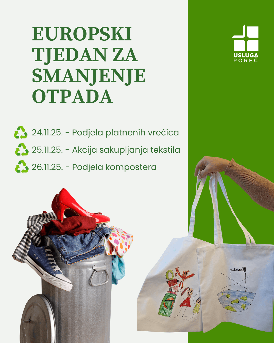 Od ponedjeljka, 24.11., započinjemo tjedan pun zanimljivih aktivnosti kojima želimo potaknuti očuvanje okoliša i odgovorno postupanje s otpadom. Toga dana na gradskoj tržnici od 10:00 sati dijelimo platnene vrećice oslikane rukama najmlađih iz DV Radost – idealan način da vaša kupovina postane ekološki prihvatljivija i šarenija.
